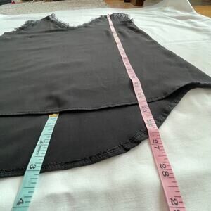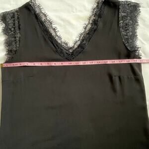 Elegant black blouse featuring delicate lace trim along the V-neckline and cap sleeves. Designed with a soft, lightweight drape and a slightly rounded hem. Perfect for layering under a blazer or styling with denim for an effortlessly chic look.