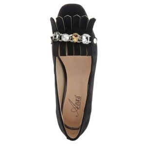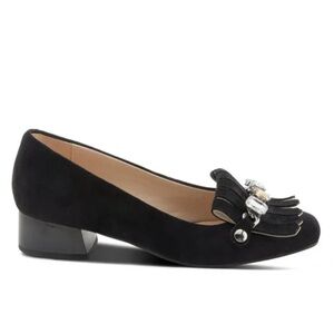 Elevate your wardrobe with these chic black loafers, adorned with stunning gemstone details. Perfect for adding a touch of elegance to any outfit.