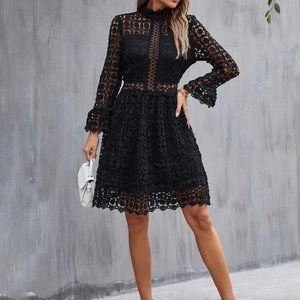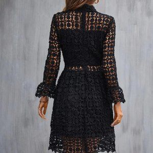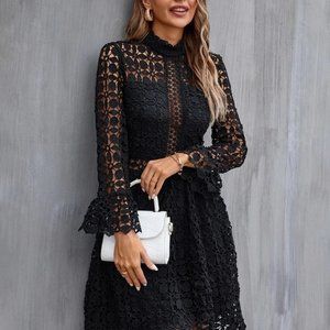 Chic Black Mock Neck Flounce Sleeve Lace Dress
