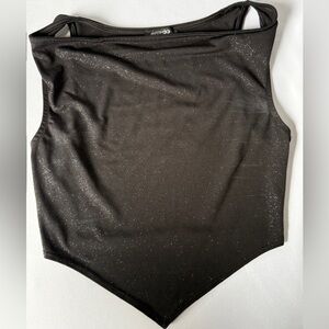 This chic black off-shoulder bodysuit is a must-have for your wardrobe. Its sleek design and shimmering fabric make it perfect for any occasion.