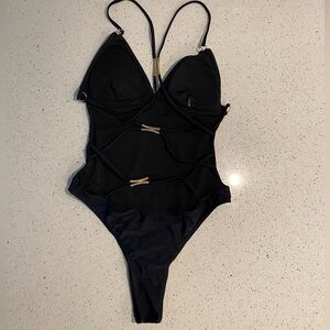 NWOT Elegant gold Strappy black one-piece swimsuit. Features a stylish design with thin straps. Size Medium. Excellent condition. Never worn. Closet kept in a smoke free home