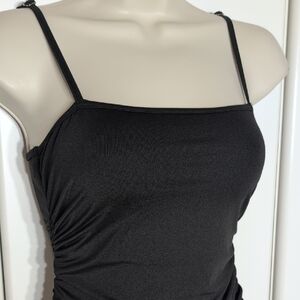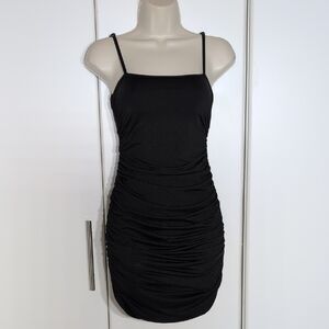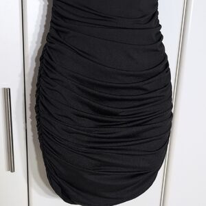 Step out in style with this chic black ruched mini dress. Perfect for any occasion, its sleek design ensures a flattering fit.