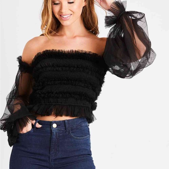 This chic black off-shoulder blouse features stylish ruffle details and sheer sleeves, perfect for any occasion. Pair it with jeans or a skirt for a fashionable look.