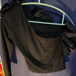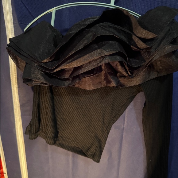 Trendy black off-shoulder top with layered ruffles. Ideal for a fashionable look.