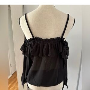 Elevate your style with this chic black blouse featuring elegant ruffles and a flattering fit. Perfect for any occasion.