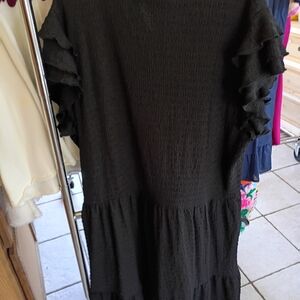 This chic black dress features elegant ruffled sleeves, perfect for any occasion. Its timeless design ensures a sophisticated look.