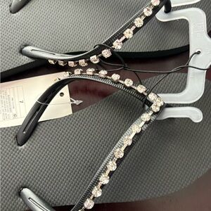 Elevate your casual look with these chic black sandals, featuring dazzling rhinestone detailing. Perfect for adding a touch of sparkle to any outfit.
