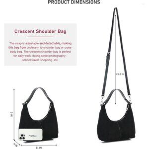 Features: A sleek, crescent-shaped bag with a soft yet durable vegan leather exterior. The adjustable and detachable strap allows you to switch from shoulder, crossbody, or handbag styles, perfect for any occasion. Just the right size—compact but roomy enough to hold your phone, wallet, sunglasses, and essentials, with a handy zippered interior pocket.
