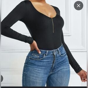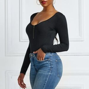 Discover elegance with this chic black bodysuit, featuring a sleek zip-front design and long sleeves. Perfect for any occasion.