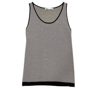 Elegant tank top with black and tan stripes. Ideal for everyday style. This is a size large but measures like a size small (possibly medium) so please check your measurements to make sure it’s a good fit for you. Beautiful materials of 80% Viscose and 20% Nylon. Chest stretches out to 33”-36” and Length 25”.