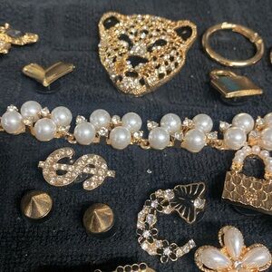 Elegant gold and pearl charm set featuring a variety of unique charms. Chic Bling Shoe Charms Gold and Sliver Designer Jewels Pretty Cute Chains Decorations Accessories for Women Girl Adults