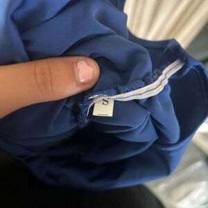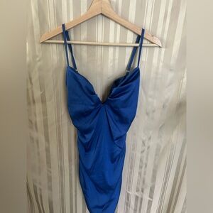 Stylish blue dress featuring elegant ruching. Ideal for any event. deep cut front, zipper in back, adjustable straps
