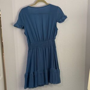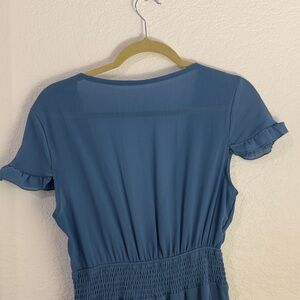Embrace a chic look with this stunning blue mini dress, featuring playful ruffles and a stylish tie-front. Perfect for any occasion.