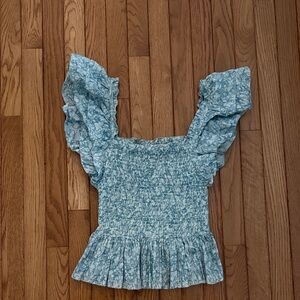 Stylish blue blouse with elegant ruffled sleeves. Perfect for adding a touch of sophistication to your wardrobe.