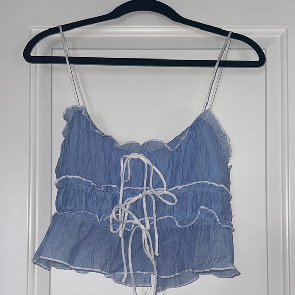 Add a touch of chic to your wardrobe with this stylish blue ruffled crop top. Ideal for both casual and special occasions.