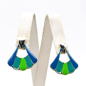 Chic Blue and Green Fan Earrings, Vintage Gold Tone with Retro Flair