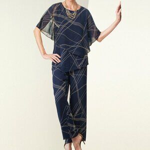 "From the abstract stripes to the angled tiers, everything about this 2-piece chiffon set is stunning and striking. Flutter sleeves have the top flowing into the room with grace and elegance. The pull-on pants are just as dreamy and easy to wear thanks to the all-around elastic waistband. For parties, celebrations, special evenings, and more, this set will always be your plus 1."