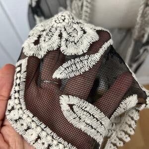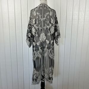Stylish extra long black lace duster with intricate design, vintage boho look and vibe. Sheer with embroidered cream colored floral design.Looks great over practically anything! Jeans and boots! Skirts and dresses! Shorts or as swimsuit coverup! Really pretty on! Older piece. No pockets. Great preowned condition 🌺