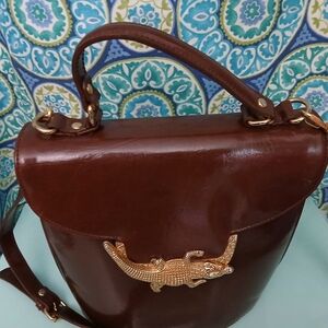 Chic Brown Crossbody Bag with Gold Crocodile detail.