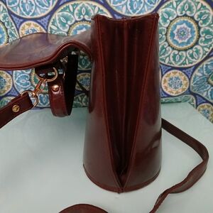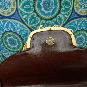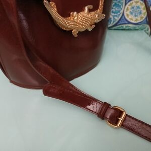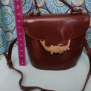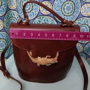 This stylish crossbody bag features a rich brown color with a fun gold crocodile accent. Perfect for adding a touch of fun and sophistication to any outfit.