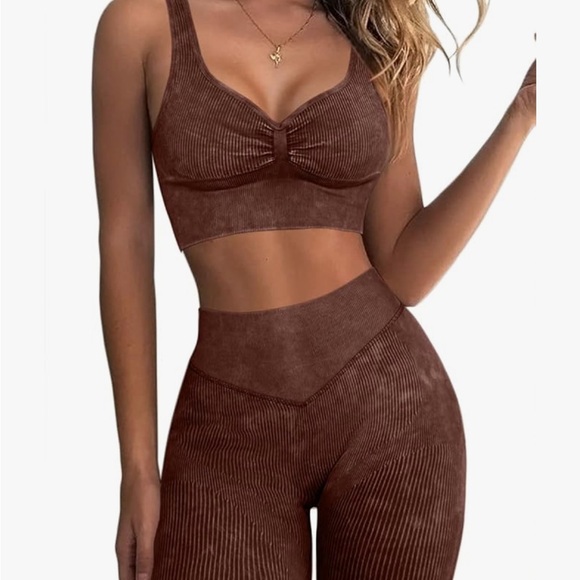 Trendy brown ribbed set featuring a crop top and high-waisted leggings. Ideal for casual outings.