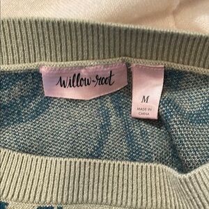 Elegant Willow Root by Buckle sweater featuring a unique cutout and swirl design in green and blue.