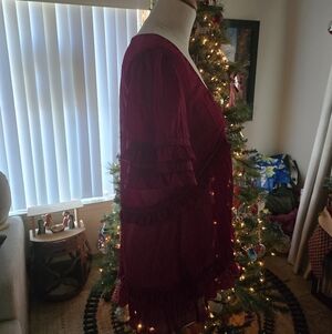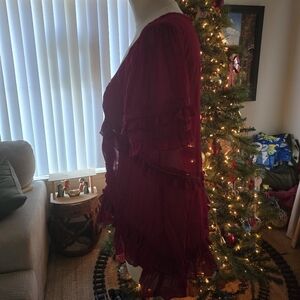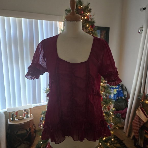 This chic burgundy blouse features elegant ruffle accents and a flattering neckline, perfect for any occasion.