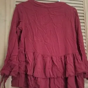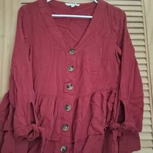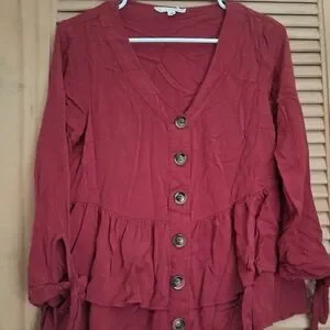 Elevate your wardrobe with this chic button-front ruffle blouse. The vibrant red hue adds a pop of color to any ensemble.