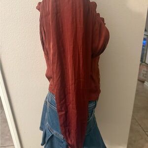 Elevate your style with this chic rust blouse. The button-up design and ruffled neckline add a touch of elegance. Perfect for any occasion.