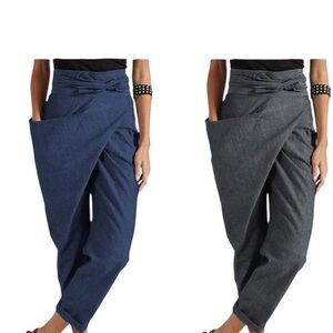 Really comfortable mid length pants that look like a wrap skirt . size medium the tie belt is detachable. There is a large pocket in the front and the approximate measurements are 24 inch inseam 30 inch waist. ho is looking for something different , unique and high-quality. My shop is named after my grandmother who taught me how to shop. I only sell my own possessions that focus on eclectic style for every day wear. Everything comes from my smoke free home.Measurements are APPROXIMATE and provided as a general guideline. Take into consideration: cut of item, rise, fabric, etc. Allow +/- 1" discrepancy..My mission is to make sure you love your purchase. If you are looking for one of a kind affordable items, this is the place to shop. I welcome all reasonable offers! All packages will be photographed prior to mailing so that you can see our professional packing.