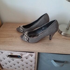 Elevate your look with these chic chain-embellished peep-toe heels. The perfect blend of style and sophistication.
