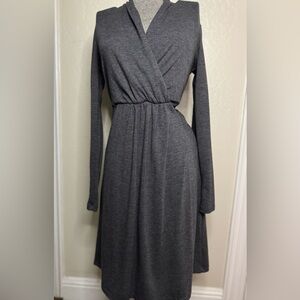 Change up your style with this chic charcoal wrap dress. Perfect for any occasion, its long sleeves and flattering fit make it a wardrobe essential. It’s truly a throw & go staple wardrobe favorite for this fall & winter. Accessorize to change up this basic essential part of creating a style. Its size small but stretches. If you are small but busty like me. It’s a good fit. Perfect length for tall boots or tights with short boots.