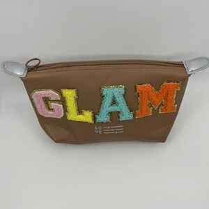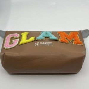 Introducing our Chenille Letter Patch Makeup Bag with a touch of vintage Hollywood glamour, this small shell white cosmetic bag exudes sophistication and elegance. Sewn chenille varsity letters spell out GLAM, adding a cute and personalized touch to this timeless beauty essential. Crafted with a waterproof PU leather fabric and featuring two-way metal zippers, this travel bag is perfect for organizing your skincare essentials on the go. It's a must-have for girls who love to travel and a trendy and stylish gift option for birthdays, holidays, and special occasions. Elevate your beauty routine with this chic and functional makeup pouch.