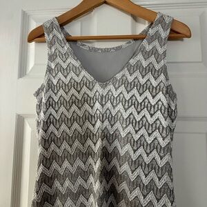 Elevate your wardrobe with this chic chevron pattern mini dress. The stylish silver and gray design offers a modern and sophisticated look, perfect for any occasion.
