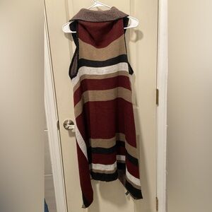 Elegant wrap with bold color blocks. Features deep red, tan, and black hues. Perfect for a stylish look.