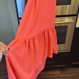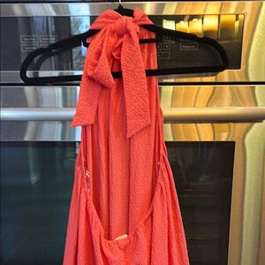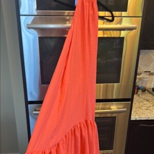 Elegant coral halter maxi dress with a ruffled hem. Ideal for summer events.