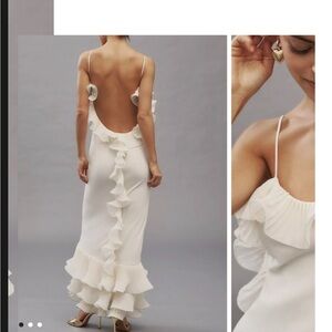 chic cream backless dress, featuring elegant ruffles for a touch of sophistication. Perfect for any special occasion. Worn once. Dry cleaned and in perfect condition!