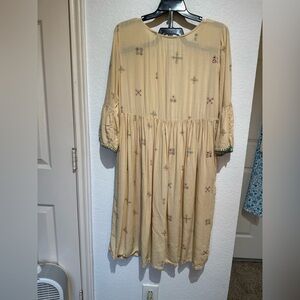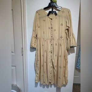 Stylish cream dress featuring colorful embroidery and a button-down design.