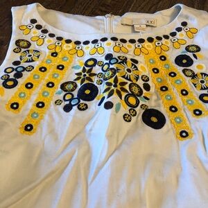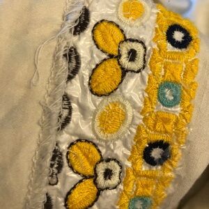 ⭐️💫Chic Cream Embroidered Sleeveless Shift Dress. This stylish cream-colored dress features intricate embroidery in shades of yellow, blue, and brown around the neckline and along the hem. The embroidery forms a decorative floral and geometric pattern. It has a classic sleeveless shift silhouette, offering a comfortable and flattering fit. Perfect for a unique and artistic statement!