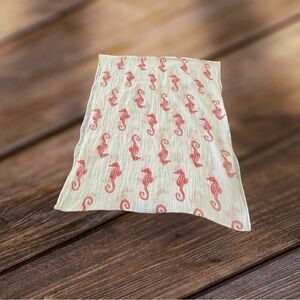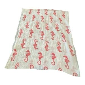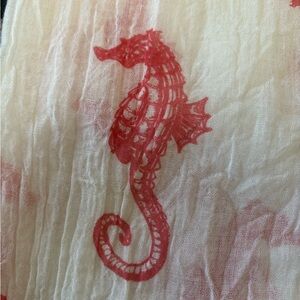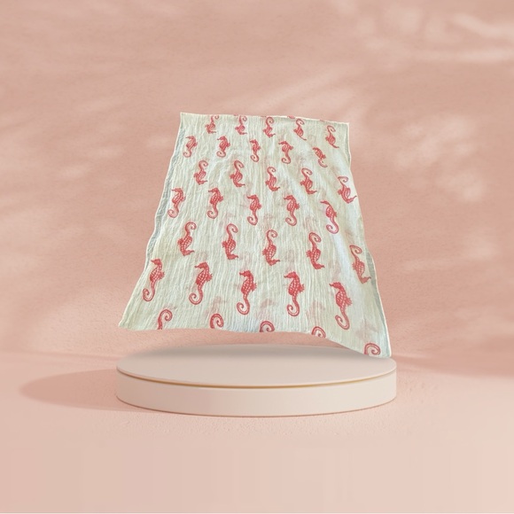 Stylish cream infinity scarf adorned with red seahorse motifs. A perfect accessory for ocean lovers. Made in China. Hand wash in cold water.