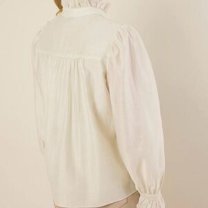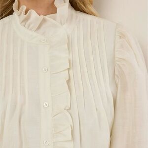 Elevate your style with this chic cream blouse featuring elegant ruffles and a button-down front. Perfect for both casual and formal occasions.