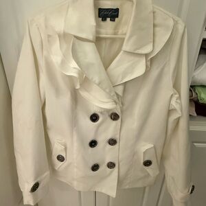 Elevate your style with this chic cream blazer featuring elegant ruffles and a classic double-breasted design. Perfect for any sophisticated ensemble.