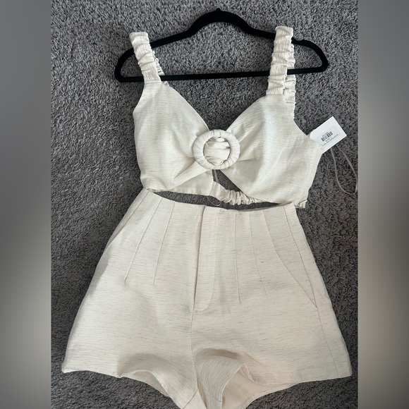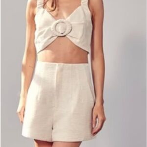 Stylish cream two-piece set featuring a ruched top with a unique front buckle design. Ideal for any occasion.
