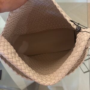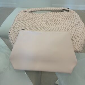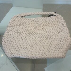 Elevate your style with this chic cream woven hobo bag. It has a clasp and makeup pouch. Its elegant design and roomy interior make it a versatile accessory for any outfit. Measurements 12.5×13×6.