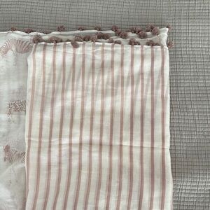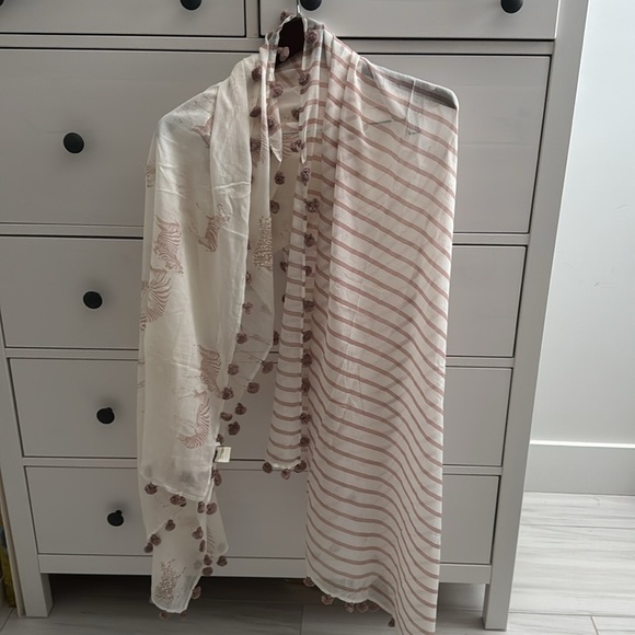 Stylish cream scarf with pink zebra design. Features charming pom-pom accents and bling.