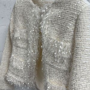 Stylish cream tweed jacket featuring elegant fringe details. Perfect for adding a touch of sophistication to any outfit.