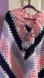Elegant handmade crochet poncho in pink, dark blue, white and purple. Features stylish fringe detailing.