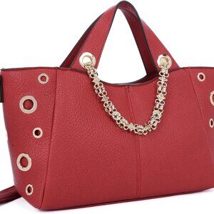 Features: This fashionable faux leather tote features a distinctive lychee pattern and 10 gold signature rings along the structured sides, giving it a striking look. The versatile design includes a top handle and an adjustable, removable shoulder strap, allowing you to wear it as a tote, crossbody, or shoulder bag. It has a practical back-zip pocket for quick access to keys or cards—perfect for busy days. Interior space is generous enough to fit your tablet, water bottle, wallet, makeup, and more. Durable vegan leather with reinforced stitching ensures long-lasting style.