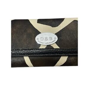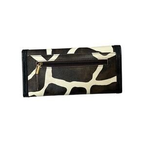 Make a bold statement with this fun and stylish trifold wallet! Featuring a striking brown and cream giraffe print on a textured material with black leather trim. The front is accented with a silver-tone D&B Dooney 1975