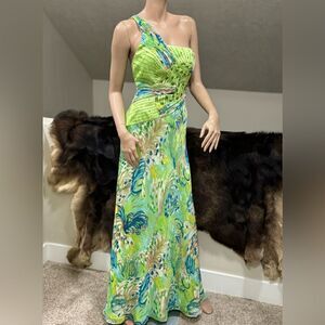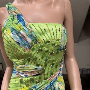 One of a kind, great quality. Chic asymmetrical pleated design. Exquisite beading, sequins & crystals at the top. Gorgeous movement with this chiffon gown, ready for your next formal event.